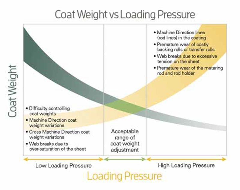 Excess loading pressure can also lead to difficulties including: Machine direction lines (starvation streaks) in the coating; premature wear of costly backing rolls or transfer rolls; web breaks due to excessive tension on the sheet; and premature wear of the metering rod and rod holder.