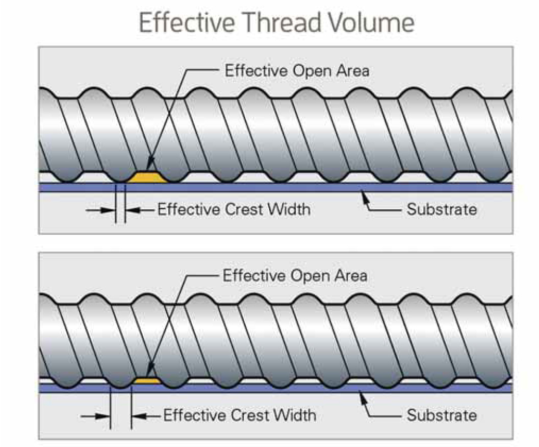 In addition to reduced coating volume, this effect also increases the effective width of the thread crests which can lead to rod lines and other coating defects.