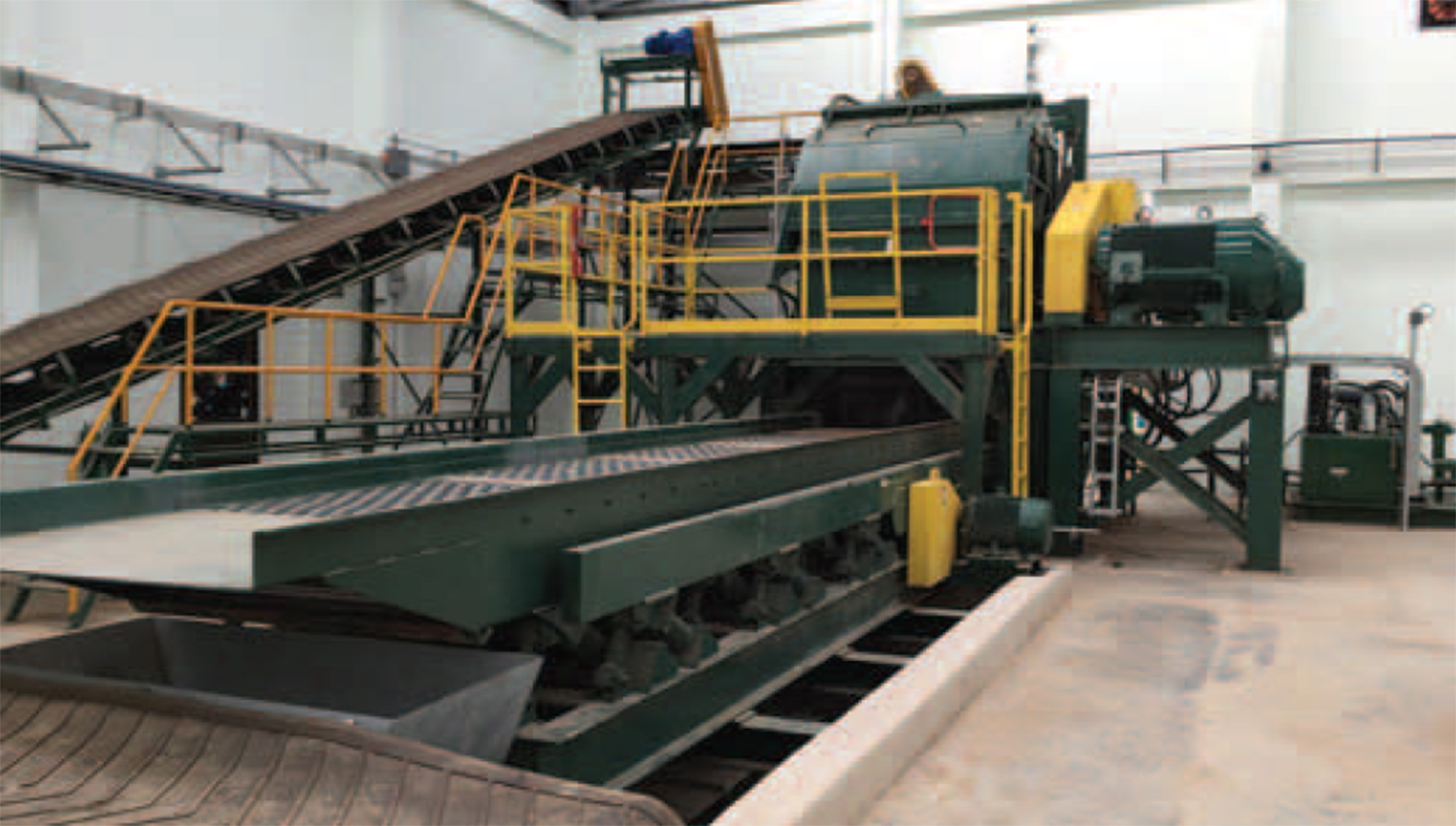 Large and bulky material is easily processed to an approximate four-inch minus by the rugged and reliable Titan grinder that features a 54-inch diameter by 72-inch wide rotor assembly with hammers with each having a weight of 198 pounds. The unit is equipped with reversible and replaceable tips to further reduce maintenance time and expense. The pivoting grinder housing allows for easy maintenance access to the rotor and screens.